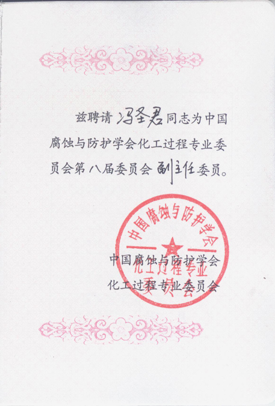鑒于馮圣君在中國腐蝕與防護領(lǐng)域的杰出貢獻與不懈追求,中國腐蝕與防護學(xué)會經(jīng)過認真考察,決定聘任其擔(dān)任化工過程專業(yè)委員會副主任,代表企業(yè)界參與學(xué)會工作。